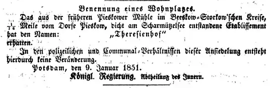 In der ersten Hälfte des 19. Jahrhunderts muss das Mühlenanwesen zu einem landwirtschaftlichen Hof um- oder ausgebaut worden sein. Denn 1858 ist der Komplex in der Landgemeinde Pieskow als Ackergehöft mit einem Wohn- und drei Wirtschaftsgebäuden, in denen sieben Personen ansässig waren, verzeichnet.[4] Erstmals als Theresienhof wurde das „Etablissement“ kurz zuvor im Amtsblatt der Königlichen Regierung zu Potsdam und der Stadt Berlin (Regierungsbezirk Potsdam) von 1851 benannt:[5]