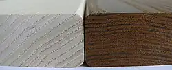 Thermisch modifiziertes Holz (englisch: Thermally Modified Timber, kurz TMT) ist das Endprodukt einer thermischen Behandlung (Erhitzen) von Holz auf mindestens 160 °C bei Sauerstoffmangel.[1] Die Bezeichnung Thermoholz wird häufig synonym verwendet.[2] Ziel der thermischen Holzmodifikation ist es, technische Eigenschaften des Baustoffs Holz über den gesamten Holzquerschnitt für bestimmte Einsatzzwecke zu verbessern. So sorgt z. B. die durch Hitzebehandlung erzielte hohe Fäulnisresistenz dafür, dass sich auch heimische Hölzer für den Einsatz im Außen- und Nassbereich eignen, ohne dass nach kurzer Zeit Schäden durch Pilzbefall entstehen. Die verringerte Wasseraufnahmefähigkeit von Thermoholz reduziert die für Holz typische Neigung zum Quellen und Schwinden, Schüsseln und Reißen.