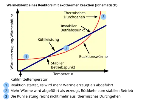Die Gefahr des thermischen Durchgehens entsteht insbesondere dann, wenn ein Reaktor am instabilen Betriebspunkt betrieben wird. Ein Reaktor hat im Allgemeinen drei mögliche Betriebspunkte, an dem die durch Kühlung abgeführte Wärmemenge der Menge entspricht, die durch die exotherme Reaktion erzeugt wird.