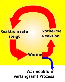 Exotherme chemische Reaktionen müssen durch Kühlung kontrolliert werden. Dabei muss die Kühlung in einem dynamischen Gleichgewicht mit der Wärmeerzeugung der chemischen Reaktion so geführt werden, dass nur so viel Wärme abgeführt wird, dass zum einen die Reaktion nicht überhitzt, zum anderen genügend Wärme für den Fortgang der Reaktion im System bleibt. Eine Temperaturerhöhung um 10 °C beschleunigt jede chemische Reaktion um den Faktor 2 bis 3 (sog. RGT-Regel).