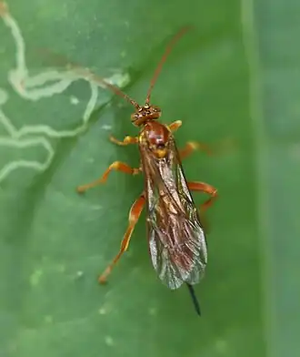 Die mittelgroßen Schlupfwespen sind gewöhnlich zwischen 10 und 12 mm lang. Ihr Körper ist gelbrot bis rot gefärbt. Die Fühler sind gelbrot. Die überwiegend gelbroten Beine weisen gelbe Partien auf. Die Mandibelspitzen sind schwarz.[2] Ferner befinden sich über den Einlenkungen der Fühler schwarze Flecken.[2] Der Thorax weist schwarze Flecke unterschiedlicher Größe auf.[2] Das Scutellum und das Metanotum (Hinterbrust) sind größtenteils gelb gefärbt.[2] Der Thorax ist nur spärlich weißlich behaart.[2] Die Bohrerklappen der Weibchen sind in der Regel 1,0–1,2 mal so lang wie die hinteren Tibien.[2]