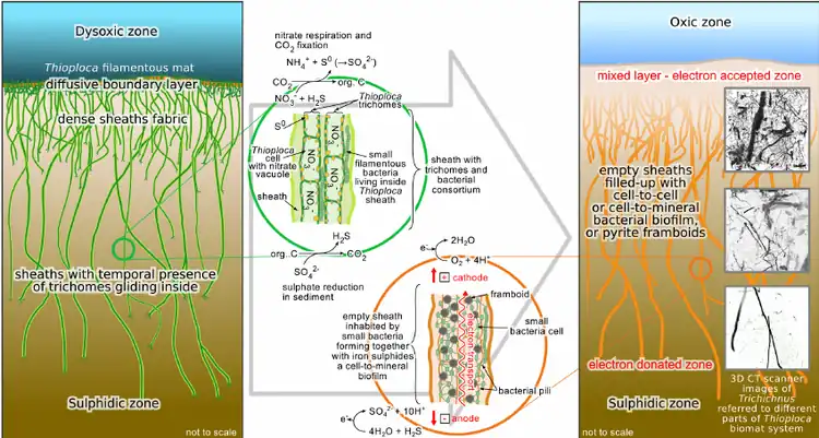 Andererseits zeigten die Zellen eine Aufnahmekapazität für Kohlendioxid (CO2) und verschiedene Substrate (Acetat, Aminosäuren, Bicarbonat, Glukose, Glycin usw.). Aus diesem Grund werden diese Mikroorganismen als sehr gutes Beispiel für mixotrophe Bakterien angesehen.[14][9] Ihre grundlegende Strategie basiert auf der Organisation in Trichomen (d. h. Zellaggregaten in Bündeln, die von einer Hülle umgeben sind), auch wenn sie unter Umständen als freilebende Trichome vorkommen können. Thioploca werden im Wesentlichen als Schwefelbakterien definiert, die in der Lage sind, hauptsächlich Schwefelwasserstoff (H2S; oder Sulfide) zu oxidieren und Nitrat (NO3) in einer speziellen Vakuole in ihren Zellen zu akkumulieren.[12][9] In der Vakuole kann die Nitratkonzentration auf bis zu 0,5 ᴍ (mol/ℓ) ansteigen.[15] Die Zellen sind auch in der Lage, elementaren Schwefel (S0) als Ergebnis der Oxidation von Schwefelwasserstoff in Form von Tröpfchen zu akkumulieren. Diese Bakterien haben offenbar mit morphologischen, physiologischen und metabolischen Anpassungen dieses System entwickelt, um einen Stoffwechsel zu betreiben, der auf unterschiedlichen Quelle von Elektronendonoren und -akzeptoren basiert, die sich in jeweils unterschiedlichen Zonen der Wassersäule befinden und durch einen diesbezüglichen Gradienten (Konzentrationsgefälle etc., hier Gefälle am Redoxpotential) gekennzeichnet sind.[9]
