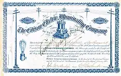 Die Edison Electric Light Co. wurde bereits am 15. November 1878 gegründet. Sie hatte das Recht, die in Menlo Park erarbeiteten Patente zu verwerten, und finanzierte im Gegenzug die Arbeit des Entwicklungslabors. Das Unternehmen gründete in den USA und im Ausland Tochter- und Kooperationsunternehmen und versorgte diese sowie andere Partner mit den notwendigen Patentrechten. Diese Gesellschaft kann daher als Kern des aus ihr entstehenden Elektrokonzerns gesehen werden. Die Edison Electric Light Company of Europe entstand im Dezember 1880. Im Jahr 1883 entstand durch eine Kooperation mit Emil Rathenau die Deutsche Edison-Gesellschaft für angewandte Elektrizität, später AEG. Ende 1886 gehörten die von Edison gegründeten Unternehmen mit etwa 3000 Mitarbeitern und rund zehn Millionen Dollar Kapital zu den großen Konzernen ihrer Zeit.[15] Die einzelnen Edison-Unternehmen in den USA hatten indes unterschiedliche Eigentümerstrukturen und Interessen. Edisons Fokussierung auf Lizenzeinnahmen aus dem Ausland statt auf den Aufbau eines globalen Unternehmens war insbesondere keine nachhaltige Strategie.[16]