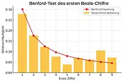 Eine im Frühjahr 2025 durchgeführte KI-gestützte statistische Analyse ergab, dass alle drei Beale-Chiffren recht genau der erwarteten Verteilung gemäß dem Benfordschen Gesetz entsprechen, womit eine zufällige Zahlenauflistung weitgehend ausgeschlossen werden kann. Eine weitere vertiefende Analyse der drei Datensätze mit einem paarweise durchgeführten Chi-Quadrat-Homogenitätstest zeigte auf, dass Chiffre 1 und 3 aus einer identischen Datengrundmenge stammen, die deutlich abweichend von jener der Chiffre-2-Zahlen sind. Die Interpretation der Daten lässt den Schluss zu, dass die Chiffre 1 und 3 keine zufälligen Zahlen sind, sondern mit mithilfe einer identische Datengrundlage verschlüsselt wurden.