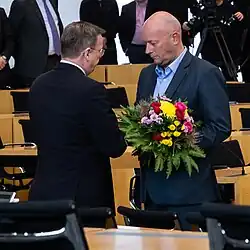 Im entscheidenden dritten Wahlgang erhielt Kemmerich in geheimer Wahl mit 45 von 90 Stimmen genau eine Stimme mehr als Ramelow. Er nahm die Wahl an und wurde als neuer Ministerpräsident Thüringens vereidigt.[47] Dies war nur dank der Beteiligung der AfD möglich. Diese hatte die Kandidatur von Kindervater zwar ausdrücklich aufrechterhalten,[46] aber gemeinsam mit den meisten Abgeordneten von FDP und CDU geschlossen für Kemmerich gestimmt und als einzige Fraktion das Wahlergebnis spontan mit Beifall quittiert.[46][48] Kemmerich wurde somit nach Reinhold Maier der zweite gewählte FDP-Ministerpräsident eines Landes in der Geschichte der Bundesrepublik Deutschland, aber zugleich der erste Ministerpräsident überhaupt, der für seine Wahl und seine Regierung auf Stimmen der AfD angewiesen war.[49][50] Laut Tagesordnung der Plenarsitzung war danach die Vorstellung seiner Regierung vorgesehen. Stattdessen wandte sich Kemmerich mit einer kurzen Rede an den Landtag und beantragte als Vorsitzender der FDP-Fraktion die Vertagung der Sitzung. Dem wurde mit den Stimmen der AfD, der CDU und der FDP, gegen die Stimmen der Linken, der SPD und der Grünen, bei einer Enthaltung, stattgegeben.[46]