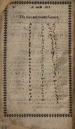 - ↑ Thomas Shelton: Tachygraphy. The most exact and compendious method of short and swift writing, that hath ever been published by any. 1645 (archive.org).