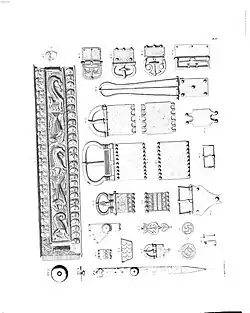 Manchettenförmige Hilze eines Schwertgriffs aus der ersten Hälfte des 3. Jahrhunderts, das mit zwei Randstücken gefertigt ist, davon trägt eins eine Runenbeschriftung. Das spitzovale Beschlagteil (Höhe: 2,3 cm) zeigt vier quadratische obere und vier schmalere untere Felder, die durch Tremolierstiche voneinander getrennt sind. Im oberen Teil (Höhe: 1,3 cm) finden sich zwei aneinanderstoßende Felder mit runenähnlichen Zeichen bzw. stilisierten Swastiken. Der Beschlag gehört zu einem Prachtschwert, das einem Gefolgschaftsführer zugewiesen wird, der nach der Verbreitung des Typs vermutlich ein angreifendes Heer aus dem Raum zwischen Rhein und Elbe anführte. Das Stück befindet sich im Depot des Nationalmuseet in Kopenhagen (Inv.-Nr. 24 963).[3]