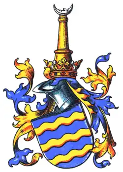 Das Stammwappen zeigt in Blau drei goldene Querströme. Auf dem gekrönten Helm mit blau-goldenen Decken eine blaue Pyramide, besteckt mit einem aufwärts gerichteten silbernen Halbmond.