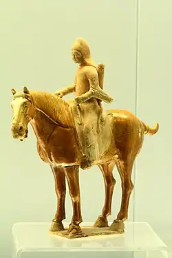 Eine tang-zeitliche Dreifarben-Keramik eines zentralasiatischen Pferdes mit Reiter. Neben dem hochbeinigen Pferd verweist insbesondere die Kleidung des Reiters mit dem „Schlapphut“, den weiten, dreiviertellangen Hosen und den Stiefeln auf eine zentralasiatische Herkunft.