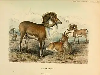 Tibet-Wildschaf (Ovis hodgsonii), Zeichnung aus Richard Lydekker (1898): Wild oxen, sheep & goats of all lands, living and extinct. | ||||||||||||