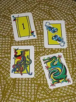 | Mah Jong | Der Mah Jong (Hanfsperling, benannt nach dem auf der Karte abgebildeten Vogel) ist als einzige vorkommende Eins (die Asse sind ja hoch) die niedrigste Karte im Spiel. Er kann als 1 in eine Straße eingebaut werden, ansonsten darf er nur als Einzelkarte gespielt werden. Sein Besitzer hat das erste Anspielrecht und darf (muss aber nicht) sich einen Kartenwert wünschen (2 bis Ass, keine Sonderkarte). Der Spieler, der in der Spielreihenfolge als Erster regelkonform eine Karte des gewünschten Werts spielen kann, muss diese spielen – selbst wenn er sein Blatt dadurch schwächt. Falls die gewünschte Karte Teil einer Bombe ist und in keiner anderen Kombination mehr ausgespielt werden kann, dann muss die Bombe auch anstandslos gespielt werden – allerdings erst, wenn der Spieler an der Reihe ist. Wird die 1 in einer Straße gespielt und sich eine Karte gewünscht, muss ggf. auch der Phönix genutzt werden, wenn dadurch eine Straße mit der gewünschten Karte gespielt werden kann. Der Phönix muss nicht als die gewünschte Karte benutzt werden. |