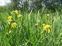 In den ausgedehnten Schilf- und Rohrkolben-Röhrichtgürteln der unverbauten Flussaltarme und Gräben bringen vereinzelt Blutweiderich, Sumpf-Ziest, Froschlöffel und die nach der Bundesartenschutzverordnung (BArtSchV) als besonders geschützt eingestufte Wasserschwertlilie violett-rote, bordeaux-rote, weißliche und gelbe Farbtupfer. Die offenen Uferflächen und Gewässerränder prägen Weidenbüsche und Auwaldrelikte mit Silber-Weide und Flatterulme. Insbesondere am Havelaltarm Toter Mantel, der bis an die Heerstraße reicht, ist eine Weichholzaue erhalten. In der artenreichen Krautflora dieser Zonen wachsen Sumpffarngewächse wie der Sumpffarn (Thelypteris palustris), Sumpf-Labkraut, Steif-Segge und Gewöhnlicher Gilbweiderich, der früher in der Volksheilkunde bei Skorbut, Diarrhoe und Fieber verabreicht wurde. Das ursprünglich aus dem Himalaya stammende Drüsige Springkraut breitet sich an feuchtnassen, nährstoffreichen Standorten der Wiesen stark aus und bildet dichte Dominanzbestände.[6][16] Der schnell wachsende und sich rasant vermehrende Neophyt wurde 1839 aus Kaschmir erstmals nach England importiert und gelangte von dort aus als Zierpflanze auf den europäischen Kontinent. Er gehört damit zu den sogenannten hemerochoren Pflanzen, die ethelochor – also gezielt – eingeführt wurde. Die wie alle Seerosengewächse in Deutschland geschützte Gelbe Teichrose bedeckt weite Teile der offenen Wasserflächen mit schwimmenden Laubblättern. Sattgelbe, zwittrige Blüten mit einem Durchmesser von 4 bis 12 cm ragen aus ihrem grünen Blättermeer heraus.[6][16]