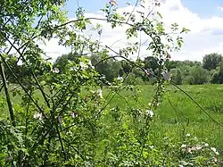 Die überschwemmten Großseggenwiesen, die die Tiefwerder-Wiesen lange dominierten, gehen aufgrund der immer selteneren Überflutungen zurück. Die bis zu zwei Meter hohe Ufer-Segge ist noch an den Gewässerrändern anzutreffen. Aus der Gattung der Seggen prägen heute Schlankseggenriede die vernässten Wiesenbereiche und Brachen. Die Kennart der Pflanzengesellschaft, die Schlank-Segge, ist eine mehrjährige, krautige Pflanze, die Wuchshöhen zwischen 30 und 150 cm erreicht. In den Verlandungsbereichen gesellt sich die in Berlin gefährdete[15] Blasen-Segge hinzu, die gelegentlich mit der Schlank-Segge eine Hybride bildet. Das Schlankseggenried besitzt bei zunehmenden Entwässerungen zwar ein langes Überdauerungsvermögen, wird aber in Bereichen besser belüfteter Böden von Rohrglanzgrasröhrichten verdrängt. Zudem bestimmen ausgedehnte Wasser-Schwaden-Röhrichte die durchnässten, sumpfigen Bereiche. Das auch Riesen-Schwaden genannte, bis zu zwei Meter hohe Süßgras bildet artenarme und nicht selten reine Bestände aus. Für Blühaspekte sorgen in den Seggen und Röhricht bestimmten Wiesenteilen von Mai bis Juli die bis zu 60 cm hohe Kuckucks-Lichtnelke mit rosafarbenen Blüten. Von Mai bis August blühen die gelbleuchtenden Blüten des Pfennigkrauts und die gelegentlich schon ab März bis April oder Juni gelb blühende Sumpfdotterblume, die manchmal im Zeitraum von Juli bis Oktober eine schwächere Zweitblüte ausbildet. In der späteren Jahreszeit fügen die Hahnenfußgewächse Gelbe Wiesenraute (Juni bis August) und, vor allem im Juni, der Gift-Hahnenfuß weitere gelbe Blühaspekte hinzu. Von Juli bis September lockern die dunkelpurpurroten Blüten der Sumpf-Kratzdistel das gelbe Blühbild auf.[6][16] Wildrosensträucher wie die Hunds-Rose öffnen im Frühsommer zahlreiche hellrosa Blüten an den Weg- und Gebüschrändern.