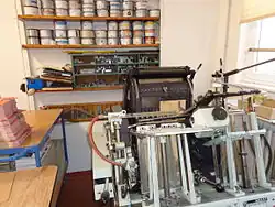 Zur Presse gehört der Farbtisch, auf welchem die Farbe dünn ausgestrichen und mit der Walze verrieben, dann aber auf die Form durch wiederholtes Überrollen mit der Walze „auf-getragen“ wird.