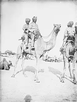 Kamele spielten in der früheren Geschichte als militärische Reit- und Lasttiere, im Vergleich zu Pferden anderenorts, eine untergeordnete Rolle.[141] Im Ersten Weltkrieg dann erlangten sie eine mit den Pferden vergleichbare militärstrategische Bedeutung. Sie trugen Soldaten, Verwundete, Wasser, Nahrung und Ausrüstung.[142] Berittene Kamelverbände spielten beispielsweise eine entscheidende Rolle beim Aufstand der Araber gegen das Osmanische Reich 1916, welcher von den Briten unter T. E. Lawrence vorangetrieben wurde. Im heißen Klima der Levante wurden Kamele genutzt, obwohl sie sich an steinige Böden erst gewöhnen mussten.[142] Schlachtlärm und selbst Giftgas schienen den Kamelen kaum etwas anhaben zu können.[143] Männliche Kamele waren insbesondere in der Paarungszeit unberechenbar.[144] Daher wurden vorwiegend Weibchen eingesetzt, obwohl man diese zeitgleich für die Zucht benötigte. Widerspenstiges Verhalten war entweder einer schlechten Behandlung oder dem Wesen der Tiere zuzuschreiben.[145] Aufwändige tierärztliche Behandlungen fanden nicht statt. Hatte sich ein Tier in unwegsamen Gelände beispielsweise ein Bein gebrochen, wurde es erschossen.[142] Briten und Araber verfügten über 50.000 Transportkamele[146] und zahlreiche berittene Kamelregimenter.[147] Die Briten beschafften sich Kamele im Mittleren Osten, Nordafrika[148] und Indien. Letztere, so stellte sich heraus, waren in den sandigen Kriegsschauplätzen doch nur bedingt nützlich.[83] Je nach den gewünschten Aufgaben wurden Kamelarten gezielt ausgewählt.[145] Besonders schnelle Kamele wurden im 1916 gegründeten Imperial Camel Corps eingesetzt.[149]
