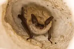 | Zwergfledermaus[15] | Pipistrellus pipistrellus | Die Zwergfledermaus hat eine Größe von 3,3–5,2 cm und eine Unterarmlänge von 28–35 mm. Sie ist an der Oberseite braun mit hellerer Unterseite, die Ohren sind dreieckig, die Flügel schmal. Sie überwintert in Höhlen und Dachböden und wird 20 Jahre alt.[30][31] | ![]() |