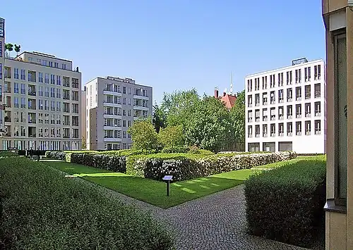In den Außenräumen setzt sich die Themenstellung von (halb)öffentlich und privat gestalterisch fort. Aufwendig ist die Wasserseite, die Corneliusstraße mit geformten Linden und Skulpturen versehen, die städtische Pflasterung der Gassen kontrastiert mit der Zurückgezogenheit der Privatgärten und dem üppig begrünten Pocket-Park (Cornelia Müller, Jan Wehberg). Dieser offenbart eine verspielte Haltung zum Thema Blockmitte als Treffpunkt von Wegen aus unterschiedlichen Richtungen.