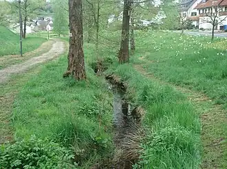 Tiergartenbach (von links) und Zulauf von der Quelle am Schloss (von hinten) | ||