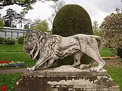 Bildhauer: Albert Güldenstein. Skulptur aus Carrara-Marmor auf einem erhöhten, rechteckigen Sandsteinpostament, Entstehungsjahr 1856 (Modell),[Anm. 5] 1857 (Ausführung),[6] unbezeichnet, Stuttgart, Wilhelma, hinten rechts am Großen Bassin (Seerosenteich). Erhaltungszustand: gut, verschmutzt, Marmor streckenweise geschwärzt, Grünbelag. Der König der Tiere schreitet kraftstrotzend auf seinen starken Pranken voran, die mächtige Bauchmähne am Boden schleifend. Das Haupt mit der charakteristischen Mähne des Löwenmanns wendet er drohend zu dem Betrachter hin, mit aufgesperrtem Rachen die todbringenden Zähne zeigend. Den langen, majestätischen Schwanz stützt er auf dem Boden ab, als wäre es ein fünftes Glied. Literatur: AKL, Büchele 1858, S. 291, Herzog 1990, S. 46, John 2000, S. 82, Wais 1954, S. 58. |