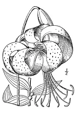 Die Pflanze blüht von Juli bis August mit drei bis sechs, in Kultur auch bis zu 20, in einer Rispe waagerecht bis nickender Blüten. Die Blüten bestehen aus sechs stark zurückgebogenen 6–10 cm langen Blütenblättern (Türkenbundform). Es sind drei lanzettförmige Kron- und drei breitere Kelchblätter, die sich aber sehr ähnlich sehen. Die Grundfarbe der Blüten ist zinnoberrot mit dunklen purpurnen Punkten. Die Nektarien sind papillös mit bewimperten Anhängseln auf beiden Oberflächen. Die Staubbeutel sind zusammenneigend und werden etwa 20 mm lang. Die Pollen sind dunkelbraun, und die weißen bis hellroten Staubfäden unbehaart. Der Fruchtknoten wird 15–20 mm groß, der Griffel 45–65 mm. Die Kapseln sind schmal-eiförmig bis länglich-rund, 3 bis 4 cm lang und reifen im September / Oktober.