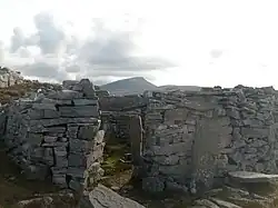 Auf der Westseite liegt der etwa 8,5 m lange und 3 m breite Rest eines angebauten geschlossenen Komplexes aus Plattenmauerwerk, umgeben von Torf, der im Inneren entfernt wurde. Vage Anzeichen eines anderen Gebäudes aus Platten befinden sich im Südwesten. Im Norden sind noch Spuren einer äußeren Umfassung vorhanden.