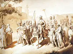 Der jüngere Tigranes floh zu Pompeius, als dieser nach Überschreiten des Araxes langsam gegen Artaxata vorrückte.[62] Nun beschloss der armenische König, keinen Widerstand mehr zu leisten. Er schickte die von ihm inhaftierten Gesandten des Mithridates VI. als Gefangene zu Pompeius und wollte dem Römer seine bedingungslose Kapitulation offerieren. Zu diesem Zweck ritt er ohne den königlichen Purpur, nur mit der Tiara und Königsbinde als Insignien seiner fürstlichen Würde, ins römische Lager. Dieses befand sich in einer Entfernung von circa 24 km von Artaxata. Beim Erreichen des Lagers folgte Tigranes II. dem Befehl der Liktoren, vom Pferd abzusteigen. Auch übergab er sein Schwert, nahm die Tiara ab und wollte Pompeius die Proskynese erweisen. Auf Aufforderung des Römers durfte er aber zu dessen Rechten Platz nehmen, während sein gleichnamiger Sohn auf der anderen Seite saß. Er wurde von Pompeius weiterhin als armenischer König anerkannt, hatte jedoch seine Eroberungen in Syrien, Phoinikien, Kilikien und Kappadokien an Rom abzutreten. Ferner musste er sich dazu verstehen, die Landschaften Sophene und Gordyene seinem Sohn zu übergeben und den Römern 6000 Talente zu zahlen.[63]