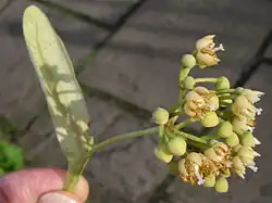 30 bis 100 Blüten stehen in einem zymösen Blütenstand zusammen, der etwa 10 bis 12 cm groß ist. Das 7 bis 10 cm × 1 bis 1,3 cm große, unterseits gelb behaarte Hochblatt ist auf einer Länge von 3 bis 5 cm mit dem Blütenstandsstängel verwachsen. Die behaarten Blütenstiele sind 7 bis 9 mm lang. Die Blüten sind stark duftend[1]. Die zwittrigen, radiärsymmetrischen Blüten sind fünfzählig. Die schmal eiförmigen Kelchblätter sind 4 bis 5 mm groß und unterseits behaart. Die Kronblätter sind 6 bis 7 mm groß. Die Staubblätter sind 4 bis 5 mm lang. Die Staminodien sind etwas kürzer. Der Fruchtknoten ist behaart und der Griffel ist etwa 4 mm lang.