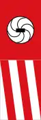 Banner: „Das Banner zeigt auf einer quergeteilten Bahn oben in Rot einen weißen mit einem schwarzen Mühleisen belegten Mühlstein, unten in Weiß drei rote Schrägbalken.“ |