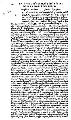- ↑ Parisinus Graecus 1807; siehe zu dieser Handschrift und ihrer Datierung Henri Dominique Saffrey: Retour sur le Parisinus graecus 1807, le manuscrit A de Platon. In: Cristina D’Ancona (Hrsg.): The Libraries of the Neoplatonists, Leiden 2007, S. 3–28. Zur gesamten handschriftlichen Überlieferung siehe Gijsbert Jonkers: The Manuscript Tradition of Plato’s Timaeus and Critias, Amsterdam 1989.