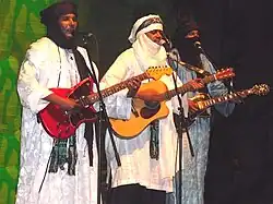 Tinariwen (Tamaschek ⵜⵏⵔⵓⵏ ‚Wüsten‘,[2] oder auch ‚leerer Ort‘ – ein Hinweis auf den kargen Lebensraum, den die Sahara bietet) ist eine Band, deren Musiker vom Volk der Tuareg stammen. Von der traditionellen Musik der Tuareg kommend, reichern sie diese mit Elementen der westlichen Rock- und Popmusik an und verwenden neben traditionellen Instrumenten auch elektrische Gitarren und elektrischen Bass. Die Texte werden in Tamaschek und auf Arabisch gesungen. Bei Auftritten tragen die Musiker die traditionelle Kleidung der Tuareg, teilweise auch den Chèche, der im Gegensatz zum Turban den Kopf und das Gesicht (außer den Augen) bedeckt.