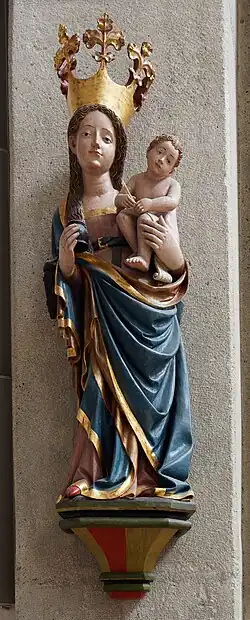 Maria trägt über dem weißen Unterkleid ein von der rechten Schulter herabfallendes kostbares blaues, goldgesäumtes Gewand. Auf dem Kopf trägt sie eine hohe goldene Krone mit fünf dreiblättrigen Lilien. Auf ihrem linken Arm sitzt der unbekleidete Jesusknabe. Er beugt sich, von der Mutter weg, in gleicher Blickrichtung mit ihr zum Betrachter herab.