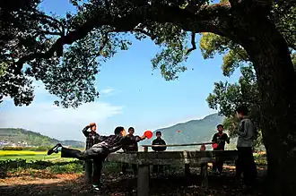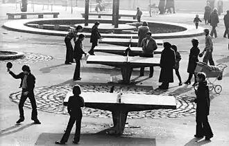 Seit Anfang der 1930er Jahre in Deutschland verbreitete,[1] besonders im Freizeitbereich populäre Variante des Spiels mit drei oder mehr Spielern. Auch als Chinesisch (Ursprung angeblich in der Heiterkeit des Spiels als Anspielung auf China als „Land des Lächelns“),[1] oder Ringelpietz, Runde, Rondo, Mäxle oder Mühle bekannt, in Österreich auch Rundgangerl, Lauferl, Raser, Rennerts oder Ringerl. Auf einer Seite des Tisches stellen sich mindestens zwei Spieler auf, auf der anderen kann einer bleiben. Nachdem ein Spieler seinen Schlag fehlerlos durchgeführt hat, rennt er auf die andere Seite und stellt sich hier an, um erneut einen Schlag durchzuführen. Jeder, der einen Fehler macht, scheidet aus. Sind nur noch zwei Spieler übrig, wird normal bis drei gespielt. Doch zuerst wird der Ball noch eingeworfen und um den Aufschlag gespielt. Der Gewinner dieser „Um die Angabe“ darf den ersten Aufschlag machen, oder die Tischhälfte wählen. Der Sieger bekommt einen Punkt Krone (den er setzen kann, um bei einem Fehler nicht auszuscheiden). Danach setzen alle wieder ein. Am Ende gewinnt derjenige, der die meisten unbenutzten Punkte (Kronen) hat. Ähnliche Spiele werden von Schulkindern häufig ohne Schläger und/oder mit größeren Bällen (meistens Tennis-, aber auch Basket- oder Fußball), aber nach gleichen Regeln und unter Verwendung einer Tischtennisplatte gespielt. Die größeren Bälle haben außerdem den Vorteil, dass auch bei Wind gespielt werden kann.