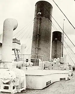 Die Olympic-Klasse gehörte dem Typ Dampfschiffe mit vier Schornsteinen an, die seit der Kaiser Wilhelm der Große von 1897 als beeindruckendste Dampfer überhaupt galten. Die Schornsteine der Titanic waren im Querschnitt elliptisch geformt. Sie türmten 70 bis 74 Fuß (21,3 Meter bis 22,6 Meter) über dem Bootsdeck und 150 Fuß (45,7 Meter) über den Kesselräumen; jeder Schornstein war für je zwei Kesselräume da. Vorn am Schornstein gab es jeweils eine Leiter, mit der man die Pfeifen des Schiffes erreichen konnte. Eigene Rohre bedienten die Pfeifen für das Ablassen von Dampf aus den Kesseln. Auf Schornstein 3 und 4 funktionierten die Pfeifen nicht, sie dienten nur der Optik.[30] Der vierte Schornstein war nicht mit den Kesselräumen verbunden, sondern diente der Entlüftung des Schiffsinneren und der Kombüse mit ihren Herden und Öfen.[31] Dies hätte technisch auch anders umgesetzt werden können, doch seit der Jahrhundertwende empfanden Reisende Schiffe mit vier Schornsteinen als besonders attraktiv.