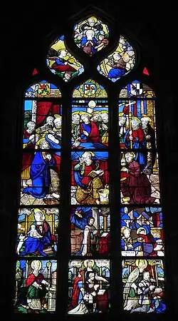 Ganz unten sind die Stifter des Fensters, Claude Ferré mit seinem Namenspatron und seine Frau Jacquette de Sévigné mit dem heiligen Jakobus, zu sehen.