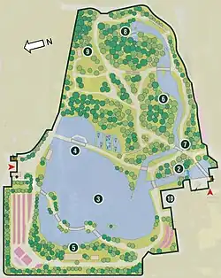 - Der Drachenberg-See (龍仙湖, Ryūsen-ko), fast die Hälfte des Parks umfassend, ist von großen Steinen eingefasst.