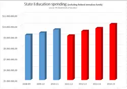 Im September 2011 forderte der Gouverneur die Schulbezirke im Bundesstaat auf, freiwillig auf die nächste turnusgemäße Gehaltserhöhung von Lehrern und anderen Angestellten im Bildungsbereich zu verzichten. Lediglich 140 der insgesamt 500 Distrikte setzten die nächste Anhebung der Bezüge aus.[44]