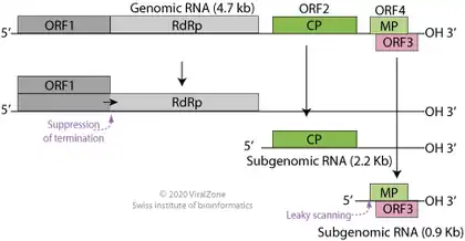 Obwohl dem RNA-Strang des Genoms der 3'-Polyadenin-Schwanz und die 5'-Kappe fehlen, werden die Proteine p33 und p92 direkt aus genomischer RNA translatiert. Wenn das Genom repliziert wird, entstehen zwei subgenomische[26] RNA-Moleküle, die als Messenger-RNA (mRNA) fungieren: Eines, aus dem das Kapsidprotein p41 (CP) exprimiert wird, und eines, aus dem die Proteine p19 und p22 exprimiert werden. Die überlappenden Gene p19 und p22 werden beide über Effekte des Leaky-Scannings übersetzt.[9] Zudem wurden mehrere Wechselwirkungen zwischen linear gut getrennten und weit auseinanderliegenden Bereichen des Genoms identifiziert mit funktioneller Bedeutung für eine effiziente Replikation.[22]
