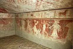 Die Wände des Grabes tragen zwei gemalte Friese. Die Hauptwände zeigen große Malereien auf rotem Hintergrund. Darüber befindet sich ein schmaler Fries auf weißem Hintergrund. Hier sind sportliche Aktivitäten dargestellt, wie Wagenrennen, Ring- und Faustkampf, Weitsprung, Reiten, aber auch Diskus- und Speerwerfen. Sie stellen den längsten Zyklus sportlicher Wettkämpfe der etruskischen Kunst dar.[3] Stilistisch werden sie oft mit attischer Vasenmalerei in Verbindung gebracht, während die Malereien der Hauptzone als authentisch etruskisch gelten.[4]