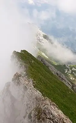 | Das Tomlishorn von Norden. Der alte Tomliweg führt von links über die Bänder zum Gipfel. | ||