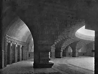 Erbaut wurde die Mehrzweckhalle durch den Architekten Wilhelm Kreis. Hierzu stimmte er sich mit Robert Meyer ab, dem Direktor seiner Auftraggeberin, der Düsseldorfer Bürohausgesellschaft.[7] In seiner Monumentalarchitektur könnte sich Kreis an dem ursprünglichen Hadrianeum in Rom und an dem Projet d’Opéra von Étienne-Louis Boullée orientiert haben.[8] Die durch Strebepfeiler und vorstehende Ziegellagen plastisch gestaltete Backsteinfassade des Rundbaus, der sich auf einem breiten, auf einem Terrassendach begehbaren Sockelgeschoss erhebt, zeigt am oberen Abschluss ein einzigartiges expressionistisches Schuppenornament, das dazu beiträgt, dem ernst und wuchtig wirkenden Bau eine künstlerisch und handwerklich veredelte Gesamterscheinung zu geben.