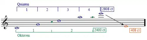Gewinnung des Tones e in einer Leiter auf c mittels Quintenschichtung. Es werden 4 Quinten (4 × 702 Cent = 2808 Cent) und zwei Oktaven (2 × 1200 Cent = 2400 Cent) durchschritten. Die Differenz führt zur großen Terz mit 408 Cent.