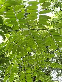 Die wechselständig und spiralig an den Zweigen angeordneten Laubblätter sind in Blattstiel sowie -spreite gegliedert und insgesamt 32 bis 120 Zentimeter lang. Der kahle oder weich behaarte Blattstiel ist 5,5 bis 20 Zentimeter lang. Die meist paarig gefiederte Blattspreite ist 50 bis 70 Zentimeter lang und 30 bis 40 Zentimeter breit, mit 8 bis 20 Paaren von Fiederblättern. Die Blattrhachis ist oft rötlich und kahl oder weich behaart. Die Stiele der Fiederblätter sind 3 bis 9 Millimeter lang und verkahlen. Die Fiederblätter sind bei einer Länge von 11 bis 22 Zentimetern sowie einer Breite von 3 bis 5,6 Zentimetern schmal-lanzettlich bis linealisch-lanzettlich mit asymmetrischer Spreitenbasis und zugespitztem oberem Ende. Der Blattrand ist gesägt oder selten glatt. Die Blattflächen sind kahl oder weich behaart, besonders auf dem Mittel- und den Seitennerven. Auffällig an den Mittelnerven und Verzweigungen der Fiederblattstiele von der Blattrhachis sind keulenförmige Drüsenhaare.[3]