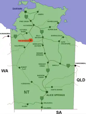 Top Springs ist selber nicht viel mehr als eine Tankstelle und ein Roadhouse mit drei Einwohnern.[1]