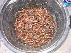 Die Pflanze überwintert mit Rhizomen, in die der Spezialzucker Inulin eingelagert wird.[7] Die birnen-, apfel- bis spindelförmigen Knollen entstehen an der Sprossbasis,[4][5] die Knollenhaut ist von beige über gelb bis rosa gefärbt[6] und das „Fleisch“ der Knolle ist weiß. Die Knollen werden etwa so groß wie Kartoffeln und sie besitzen einige „Augen“.[8] Die Haut der Knolle ist im Gegensatz zu Kartoffeln fein und dünn.[9] Die Knollen ertragen Frost bis −30 °C, wobei der oberirdische Spross nur −5 °C aushält.[2]