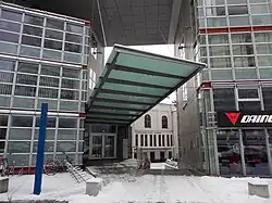 Die Baukörper des dreigeschossigen „Riegelhauses“ und dem den Riegel übergreifenden siebengeschossigen „Winkelhaus“[1] sind durch ein „Gelenk“ verbunden. Das Gelenk weist zum einen den Eingang des Gebäudes und soll so den Erschließungsschwerpunkt des Komplexes klar definieren. Zum anderen bildet mit der Baugruppe ein Tor zu dem im Blockinneren gelegenen älteren Gebäude, das bis 2015 von der Neuapostolischen Kirche[4] genutzt wurde, und hält den Blick darauf frei. Zugleich vermittelt der Gebäudekomplex zwischen den unterschiedlichen Höhen der umliegenden Bebauung.[1]