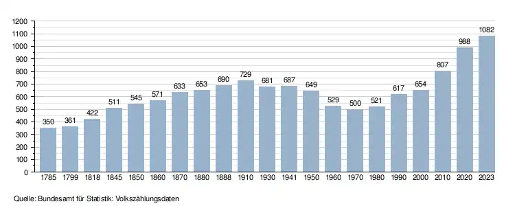 - ↑ Daten der Eidgenössischen Volkszählungen ab 1850 nach Gemeinden. (XLSX; 10 MB) Bundesamt für Statistik, Neuchâtel, 12. Juli 2024, abgerufen am 20. Juni 2025 (Öffnung in Excel nur über "Anhang/Excel-Datensatz" möglich).