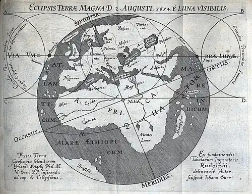 Die in der Antike begonnene wissenschaftliche Behandlung von Sonnenfinsternissen rückte erst mit der Etablierung des heliozentrischen Weltbildes durch Kopernikus und Kepler wieder in das Blickfeld der Forscher. Erhard Weigel legte 1654 eine detaillierte Vorausberechnung der Sonnenfinsternis am 2. Augustjul. / 12. August 1654greg. vor.[10] Edmond Halley sagte die totale Sonnenfinsternis vom 3. Mai 1715 vorher und gab auch den Verlauf der Totalitätszone in Großbritannien an. Er versuchte mit seinen Kenntnissen der Bahnbewegung von Sonne und Mond auch, Finsternisse in der Vergangenheit zu erforschen. Dabei stieß er auf unerwartete Widersprüche – totale Sonnenfinsternisse, die tatsächlich im östlichen Mittelmeer beobachtet worden waren, hätten Halleys Berechnungen zufolge in Spanien stattfinden müssen. Dieser Widerspruch ließ sich schließlich durch eine zunehmende Verlangsamung der Erdumdrehungen erklären: Die Tageslänge nimmt pro Jahr durchschnittlich um rund 17 Mikrosekunden zu. Über die Jahrhunderte summiert sich dieser Effekt, sodass er für die Berechnung historischer Finsternisse berücksichtigt werden muss.[11]