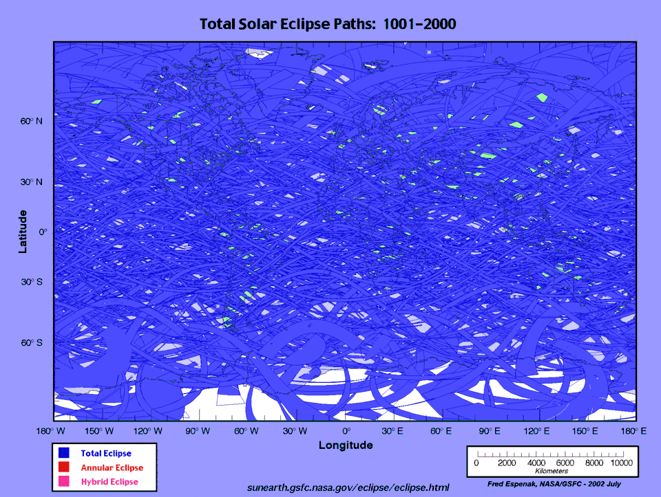 Andererseits gibt es Orte, in denen über einen Zeitraum von mehr als vier Jahrtausenden keine totale Sonnenfinsternis eintritt.[23]