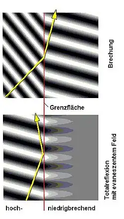 Die folgenden Darstellungen beziehen sich weiter vorwiegend auf das Beispiel der Lichtwellen, obwohl Totalreflexion bei allen Arten von Wellen auftritt.