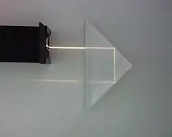 Im Bereich des sichtbaren Lichtes ist der Brechungsindex der meisten Materialien größer als von Vakuum (oder Luft).[7] Dies wird zum Beispiel in Umlenkprismen[8] und in Lichtwellenleitern[9] ausgenutzt. Hier tritt die Totalreflexion beim Übergang vom optisch dichteren Medium (Prisma, Faserkern) zur optisch dünneren Umgebung (Luft) auf, in der Glasfaser ist die dünnere „Umgebung“ i. A. eine andere Glassorte. Licht kann derart nahezu verlustfrei in eine gewünschte Richtung gelenkt werden. Glasfaserkabel können Informationen in Form des Lichtes so bis zu 20.000 Meter weit transportieren, ohne dass eine Verstärkung notwendig wird.